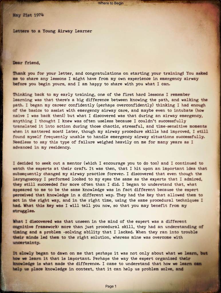 This letter is, of course, fiction. I had some great mentors, but my path to successful airway management was uneven. Sometimes I got it right; sometimes, I had to learn things the hard way. Looking back at that journey made me want to create a better path for those who come after me.