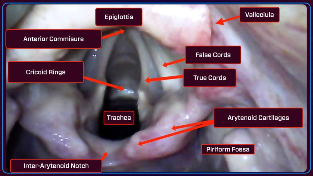 If you notice, we have not even mentioned the vocal cords as a key anatomic landmark. Instead, we’ve highlighted the anatomic structures that will help you find them. Here they are one more time.