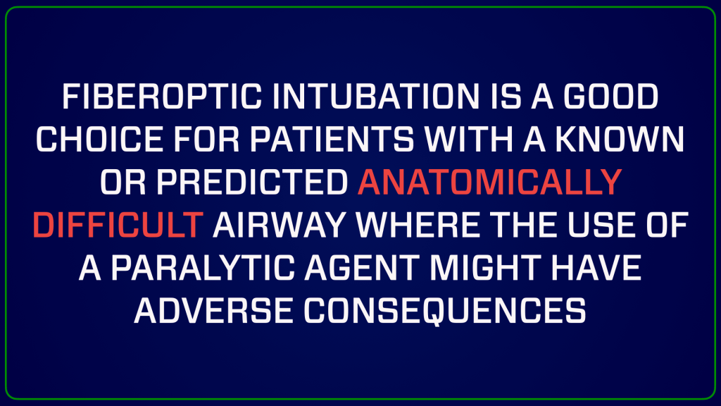 Fiberoptic intubation (FOI) is most relevant when you want to keep your patient breathing because you’re concerned that the use of a paralytic agent (most commonly with RSI) might have adverse consequences. If your patient has a known or predicted anatomically difficult airway and they are currently breathing on their own, the last thing you want to do is make the situation worse. This is where FOI shines because it can be performed “awake” using light sedation and topicalization (something we will show you how to do later), allowing you to preserve and protect a patient’s respiratory drive.