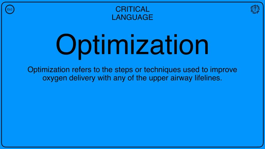 Often the initial attempt at oxygenation with the use of any upper airway lifeline is insufficient to restore adequate deliver to the alveoli. The term optimization is a reminder that getting it right on the first try is not as important, as what you do next. For every upper airway lifeline (FMV, SAD, ETT) knowledge of a series of optimization techniques is required. so you can rapidly cycle through them and optimize your performance at oxygen delivery.